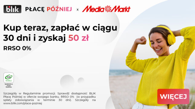 - Korzystając z promocji ”Kup teraz, zapłać mniej z BLIKIEM Płacę Później dla klientów Media Markt” zyskasz 50 zł